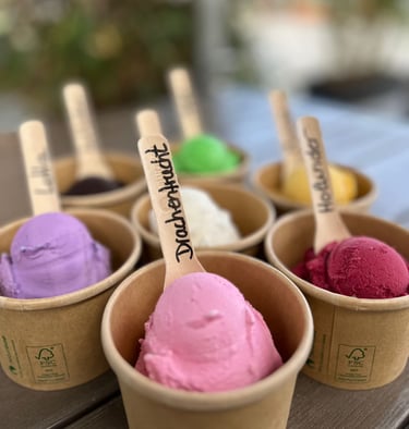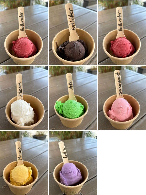 Bei uns findet Ihr natürlich auch eine große Auswahl an ständig wechselnden veganen und glutenfreien Eissorten.