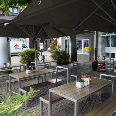 Das Eis-Sahne Paradies verfügt sowohl über eine überdachte Terrasse mit Blick auf Marktplatz und Kirche, als auch über einen großen Innenbereich.